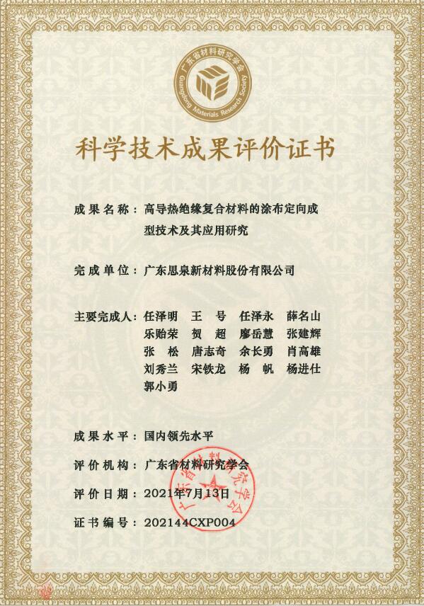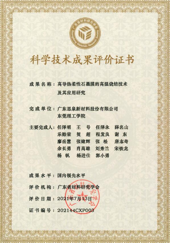 2021年7月,思泉新材完成的“高導(dǎo)熱柔性石墨膜的高溫?zé)Y(jié)技術(shù)及其應(yīng)用研究”和“高導(dǎo)熱絕緣復(fù)合材料的涂布定向成型技術(shù)及其應(yīng)用研究”兩項科學(xué)技術(shù)成果被廣東省材料研究學(xué)會認(rèn)定為具有國內(nèi)領(lǐng)先水平。
