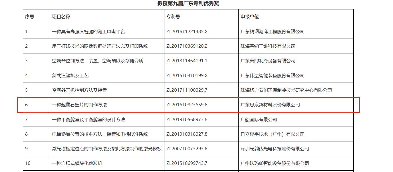 近日,廣東省市場監(jiān)督管理局發(fā)布了《廣東專利獎評選結(jié)果公示》。廣東思泉新材料股份有限公司(以下簡稱“思泉新材”)的專利技術(shù)“一種超薄石墨片的制作方法”(專利號:ZL201610823659.6)榮獲第九屆廣東專利優(yōu)秀獎。