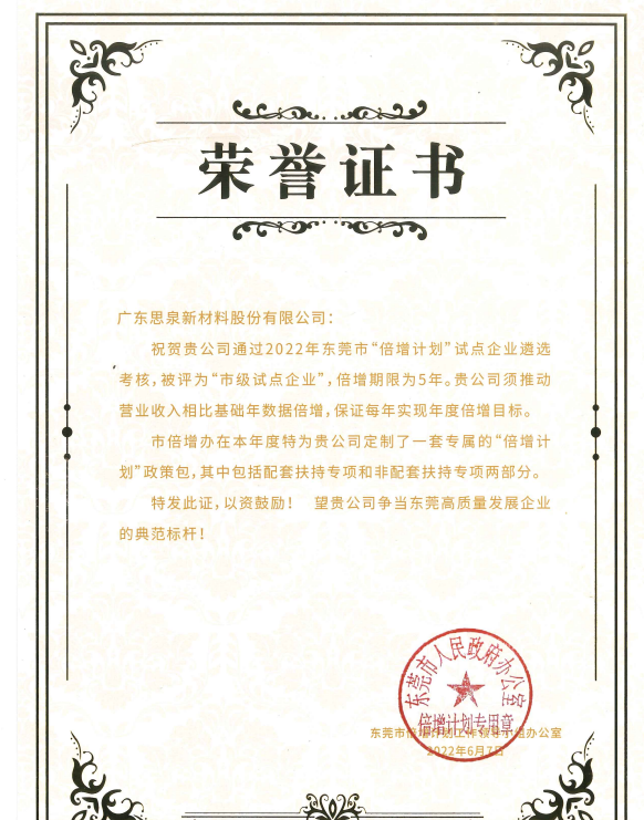 經(jīng)2022年?yáng)|莞市倍增計(jì)劃試點(diǎn)企業(yè)遴選考核,廣東思泉新材料股份有限公司(以下簡(jiǎn)稱(chēng)“思泉新材”)被評(píng)為“市級(jí)試點(diǎn)企業(yè)”。